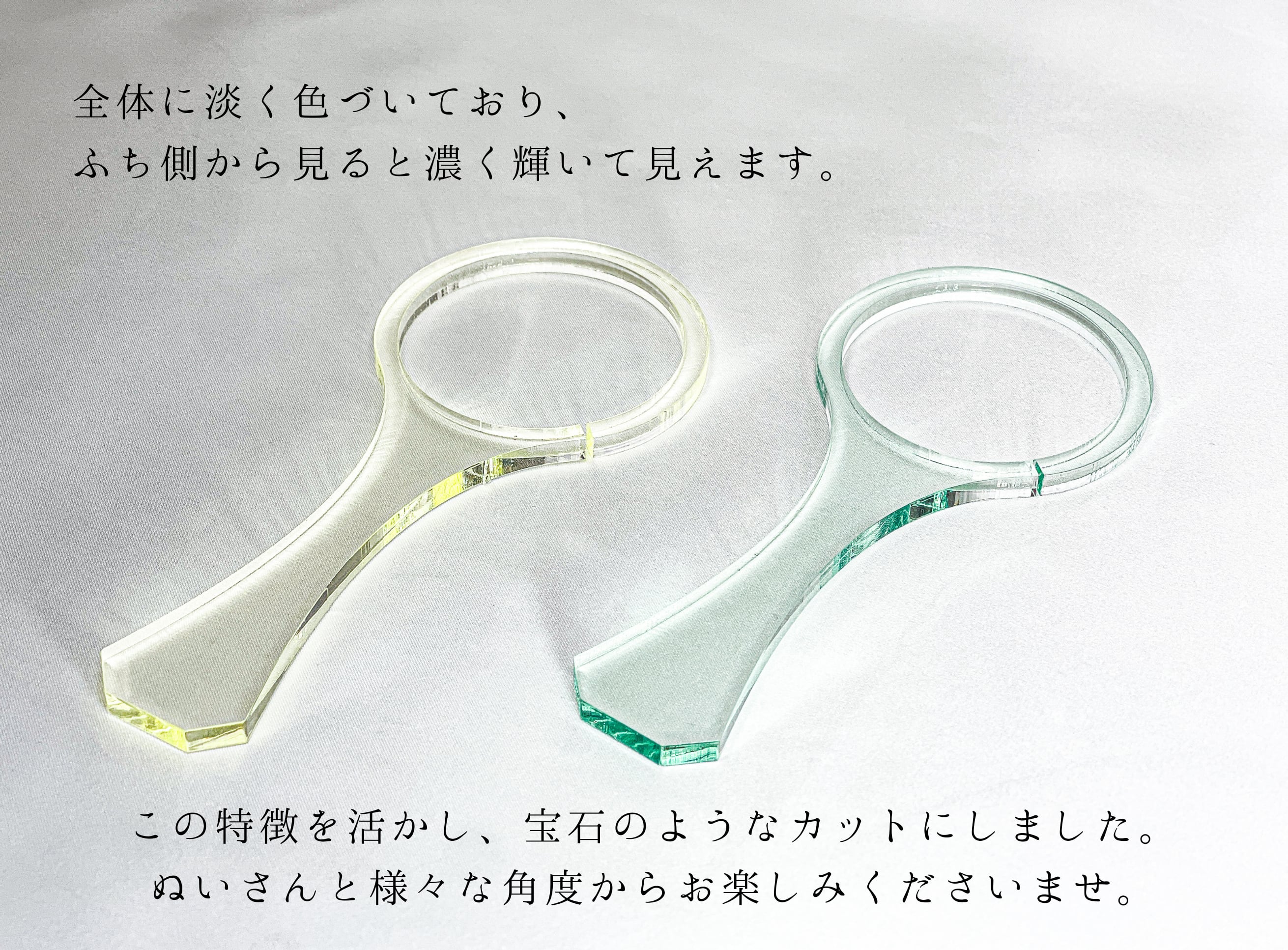 正面から見るとごく淡く色づいて見え、ふち側から見ると濃く輝いて見えます。